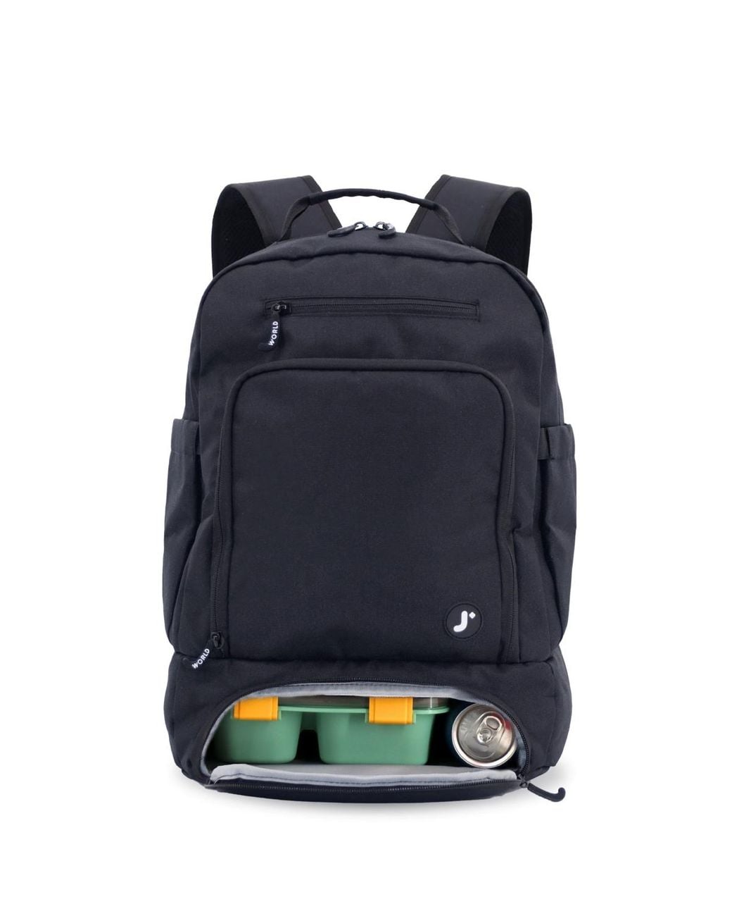This versatile Packmate backpack combines functionality and convenience, featuring a built-in insulated lunch bag to keep food fresh. It includes three large compartments for a laptop, tablet, books, and essentials, plus two interior expandable bottle sleeves for secure beverage storage. Additional features include a zip-closure stash pocket for small items like keys or accessories, and a large front zip pocket for quick access to phones, pens, or notebooks. Padded, adjustable shoulder straps, reinforced stitching, and a buckle ensure comfort and durability for carrying heavy loads. 600D POLYESTER. Color: blue