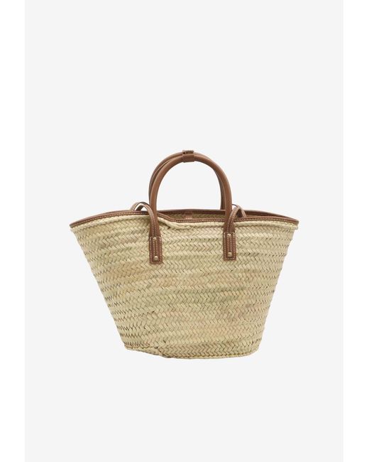 Material: 100% raffia, 100% leather. Two top tubular handles. Two thin shoulder straps. Front metal logo. Lobster clasp closure. Main compartment Color: natural
