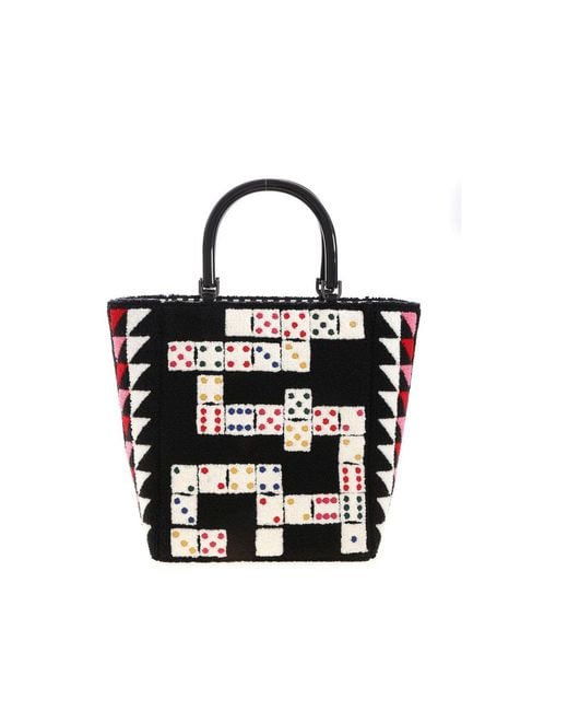 Fabric tote bag Colour: black Multicolor domino print Striped cotton lining Internal patch pocket Color: white