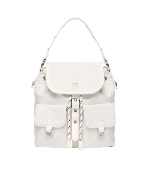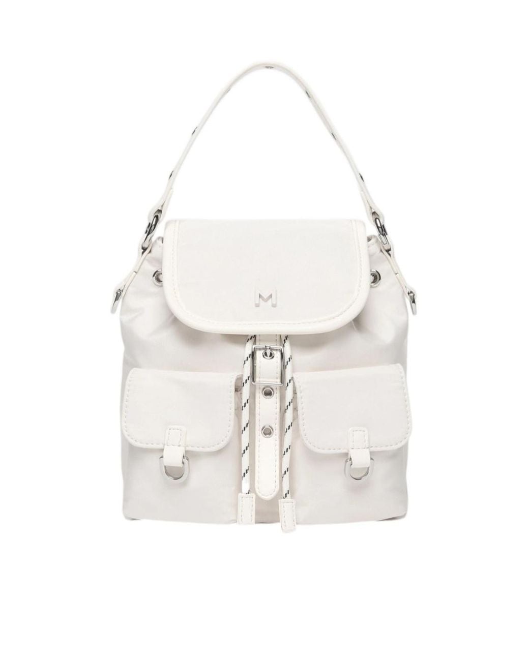 The main fabric used for this accessory contains at least 50% recycled polyester Small backpack featuring a tonal painted metal logo on the flap and a printed tag at the back Removable short coated fabric handle with eyelet detail Removable and adjustable shoulder strap, and removable backpack straps Flapover design with a magnetic snap and drawstring fastening External pockets with magnetic snap detail Shiny nickel-finish metal accessories Color: white