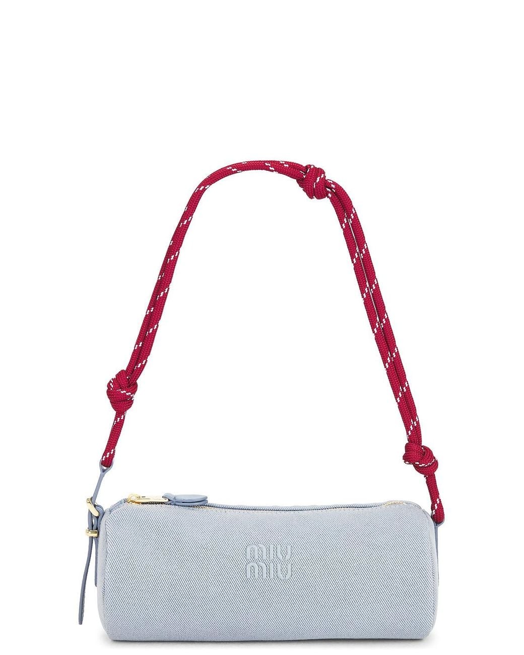 Miu Miu Gabardine Contenitori Nastro Bag in Blue Cotton exterior with re-nylon lining. Made in Italy. Top zip closure. One main compartment. Embroidered lettering logo. Adjustable technical tape shoulder strap. Gold-tone hardware. Measures approx 8.5 W x 4 H x 4 D Shoulder strap with a 7 drop. MIUF-WY228. 5NE853. About the designer: Established in 1992 by Miuccia Prada, Miu Miu reflects fashion forward, light-hearted, and provocative women. The language of Miu Miu experiments with contemporary femininity, merging rebelliousness with minimalism in order to evoke a sense of freedom within luxury fashion. As a member of the Prada family, Miu Miu is made for those who aspire to add a flair of the avant-garde to their lifestyle. Color: red