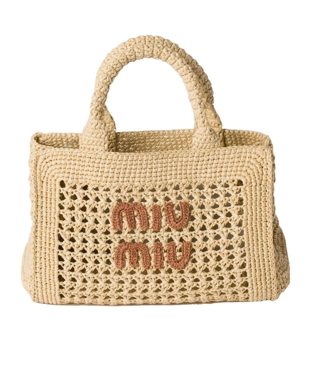 Natural colors and charming craftsmanship enhance the lines of this raffia-effect bag that evokes simple elegance and sophisticated summery style Detachable adjustable leather shoulder strap Minimum length 88 cm - Maximum length 98 cm - Minimum drop 46 cm - Maximum drop 50 cm Gold-tone hardware Unlined interior with zipper pocket Embroidered lettering logo on the front 100 VISCOSE - 100 CALF LEATHER Color: natural