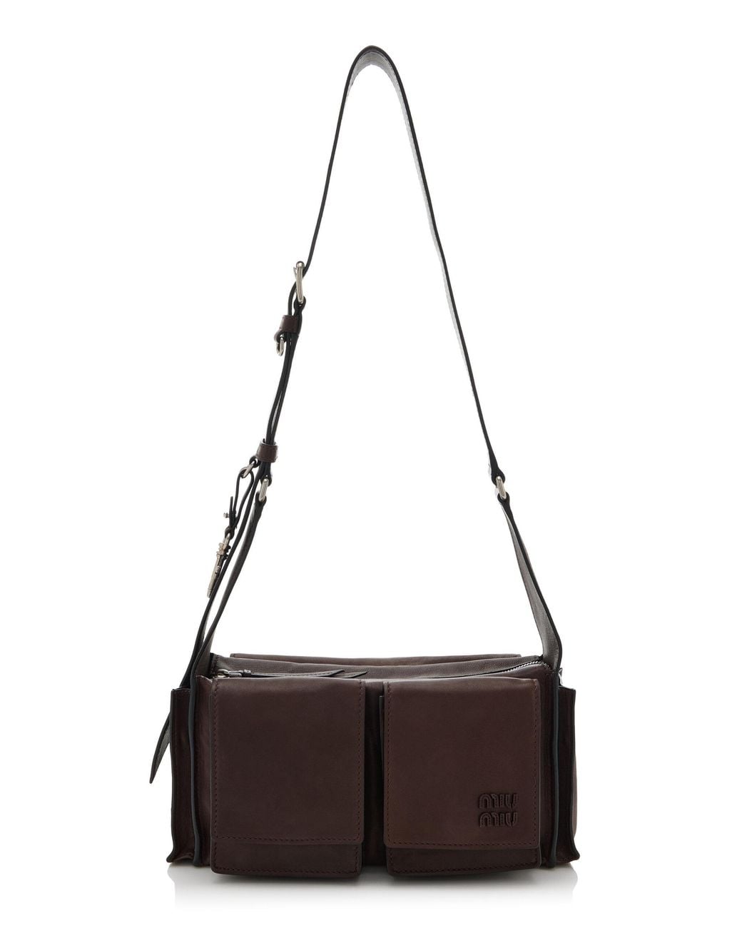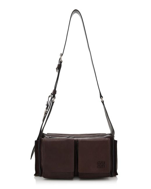 Miu Miu has served as Miuccia Prada's outlet to showcase her more playful side; without compromising elegance or style.Functional and refined; the new Utilitaire bag elegantly reinterprets the classic work bag. Presented on the catwalk; its simple silhouette is enriched with practical pockets and a convenient shoulder strap that allows it to be worn as a crossbody or shoulder bag. Soft nappa leather with an antiqued finish adds depth and an authentic texture; enhancing the style and artisan craftsmanship of the bag. Color: brown