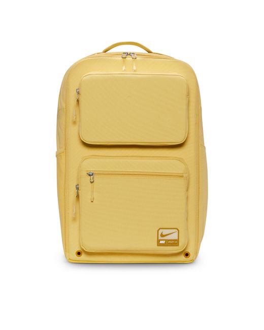If your gym locker was a backpack, this is how it'd look. The spacious main compartment has a mesh pocket, laptop sleeve and enough room for a pair of shoes and change of clothes. It makes getting from work to your next training session a breeze. Benefits:Zippered tech pocket holds up to a 16\ laptop. Padded back and shoulder straps provide a comfortable fit. Densely woven polyester provides heavyweight support. [] Product Details:11\ W x 19\ H x 6\ D. Haul handle. Chest strap. Luggage passthrough. Gusset vent. Body/Lining:100% polyester. Spot clean. Imported. Style: FN4106; Color: Saturn Gold/Saturn Gold/Ochre; Size: One Size; Gender: Male; Age Group: Adult | Nike Utility Speed Backpack (27L) in Yellow, Size: One Size | FN4106-700