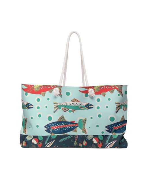 From the Tulip Lake Trout Collection, with hand drawn designs. Our oversized weekender tote is perfect for your weekend at the beach or in town. The wide-mouthed, durable bag holds a generous amount of personal items and is easily held by its thick rope handles. Before cleaning the bag, remove all the items from the bag. Suggested to pretreat visible stains with stain remover. Mix warm water with laundry detergent and clean the bag with terry washcloth or soft bristle brush. Let the bag air dry. Cotton 50%, Polyester 50% Color: blue