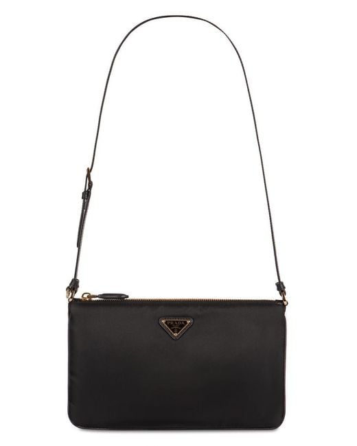Re-Nylon shoulder bag. Made from recycled materials. Leather details. Top zippered closure. Internal zippered pocket. Fabric lining with all over logo print. Adjustable leather shoulder strap. Gold-tone metal hardware. Width: 24,5 cm. Height: 14,5 cm. 100% Polyamide, 100% Calf. Gender: Women. Material: POLYAMIDE. Color: Black. Made in: Italy. Product ID: 1NE5452C05_F0002. *Import tax/duty will be calculated at checkout (If applicable)