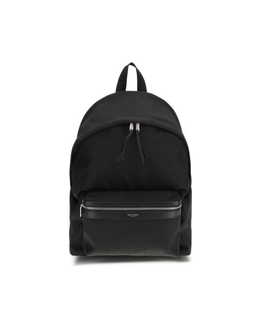 The City Backpack in leather and nylon by Saint Laurent combines urban elegance with contemporary functionality. Crafted from black Econyl regenerated nylon, it features the signature logo embossed on the front, adding a distinctive touch. Equipped with a top handle and adjustable shoulder straps, it guarantees comfort and practicality. The design includes an external zip pocket, a main zip compartment, a large padded flat pocket, and two small padded flat pockets, making it perfect for those looking for a stylish, versatile, and organized backpack. Season: SS26Dimension: 31x41x15Composition: 100% Fabric. Color: black