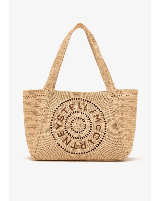 A piece that instantly evokes an out-of-office mood, Stella McCartney's iconic Logo tote bag is updated in natural raffia, ethically handcrafted by artisans in Madagascar. It boasts a relaxed silhouette with double handles, one interior slip pocket, a magnetic closure, and Stella McCartney’s logo hand embroidered on the front. Color: natural