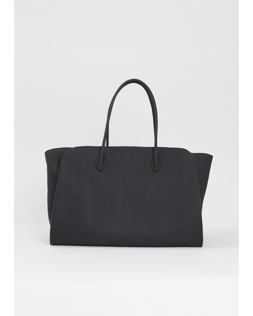 The Row black softly structured tote bag with tubular handles and gusseted side panels in grained leather. Features an interior zippered pocket, an interior slip pocket, and a top zipper closure. Lined in cotton fabric. Measures approximately: 17 W x 12 H x 6.3 D in. 100% Calfskin Leather. Made in France. Color: white