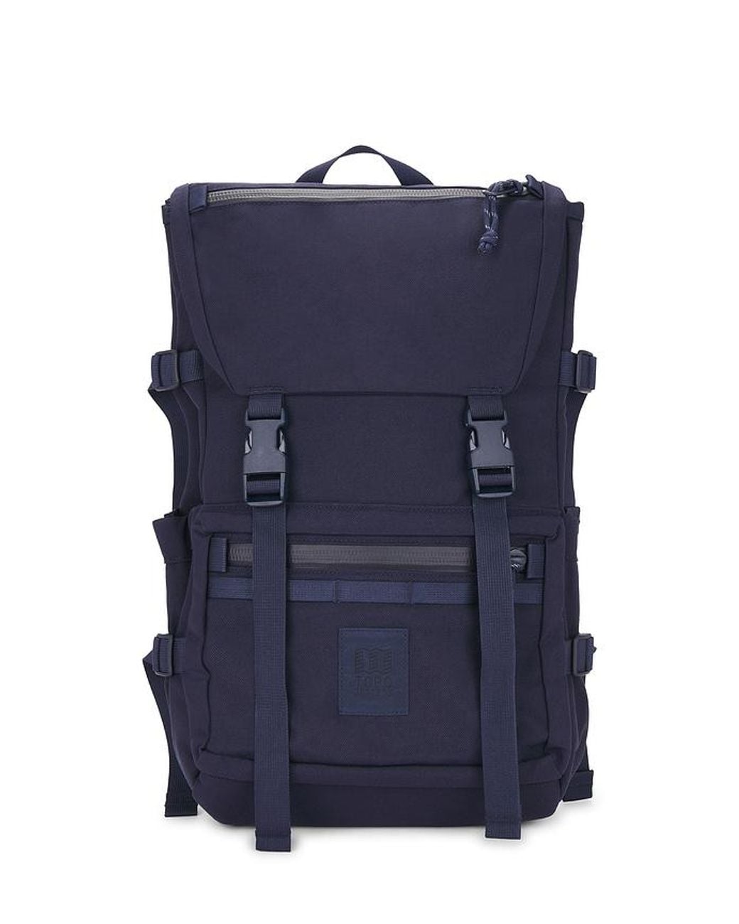 TOPO DESIGNS Rover Pack Tech Backpack in Navy. TOPO DESIGNS Rover Pack Tech Backpack in Navy. Twill exterior and twill lining. Flap top with cinch closure and dual buckle straps. One main compartment. One internal padded sleeve for 15 laptop. Two exterior zip pockets. Two side water bottle pockets. Measures approx 12 W x 17 H x 5 D. TOPR-MY24. 932441410000. Topo Designs is based around the idea of simplicity and a sense of connectedness. The brand wants to ensure an undisturbed outdoor experience by creating things that work well, but aren?t complicated or overshadowed by the latest technology. They locally produce high quality gear and clothing so people can feel a bigger sense of community every time they use one of their products. Color: blue