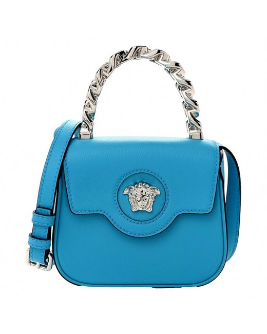 The carry-all satchel of the season.Elevate your accessory collection with the Versace La Medusa Mini Top-handle Bag, a compact statement piece in luxurious blue leather. Featuring a structured silhouette with the iconic La Medusa logo, this Italian-made bag offers a chic chain top handle and a detachable leather strap for versatile styling. The interior boasts a light purple leather finish with three card slots, and the bag closes securely with a snap closure. Measuring 6.2 inches in length, 2 Color: blue