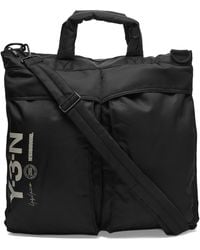 Go to SSENSEPadded recycled nylon taffeta messenger bag in gray-to-black gradient. · Adjustable webbing crossbody strap · Logo printed at face · Zip pocket at back face · Zip closure · Patch pocket at interior