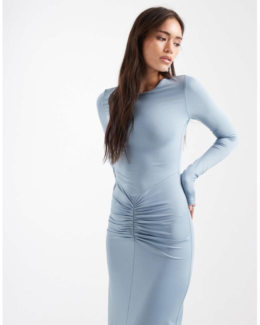 Women's Blue Long Sleeve Ruched Front Maxi Dress