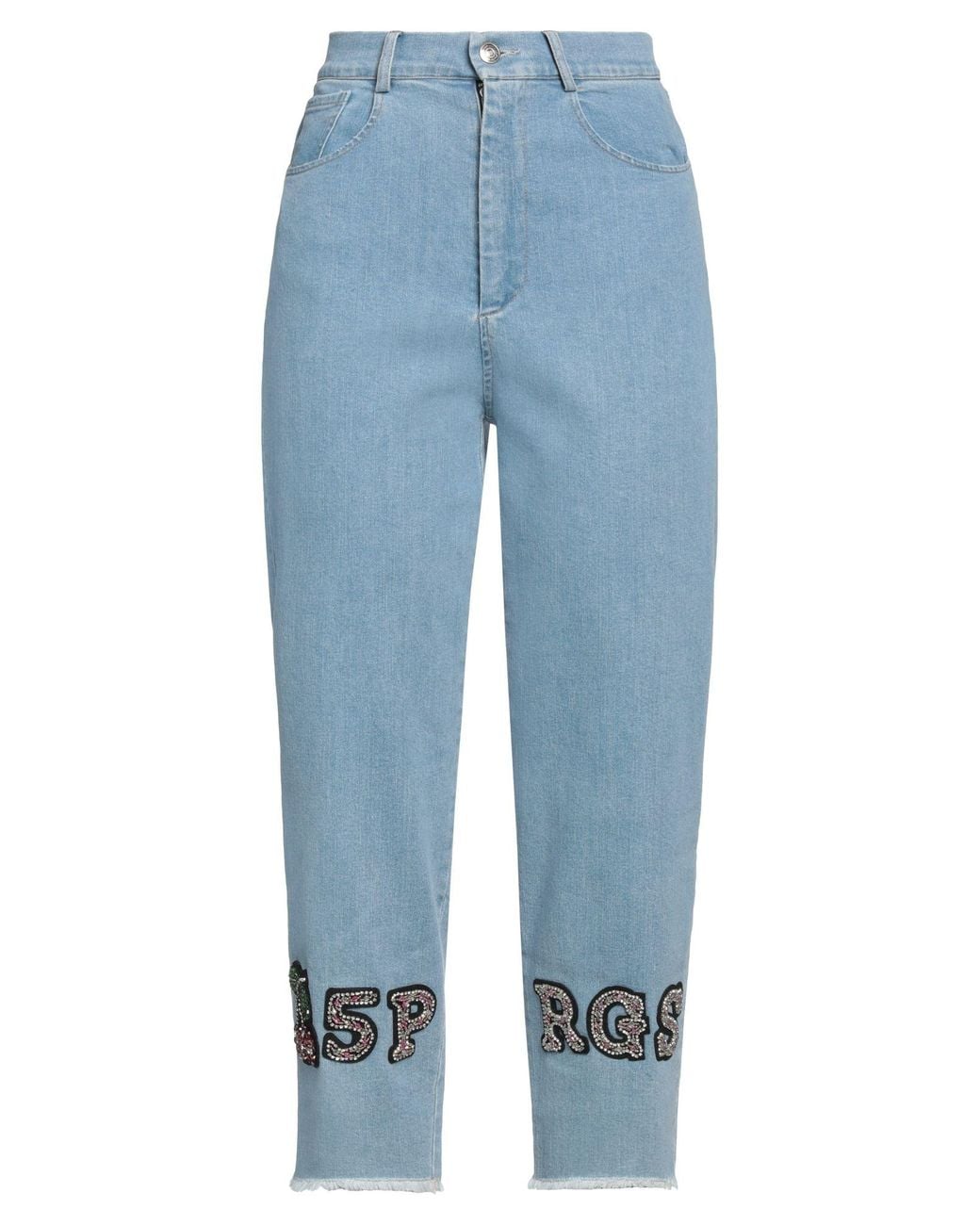 Denim, distressed, embroidered, beads, solid color, light wash, high waisted, belt loops, tapered leg, regular fit, button fastenings, zipper fastening, five pockets, tapered model , Color: Blue , Size: XS