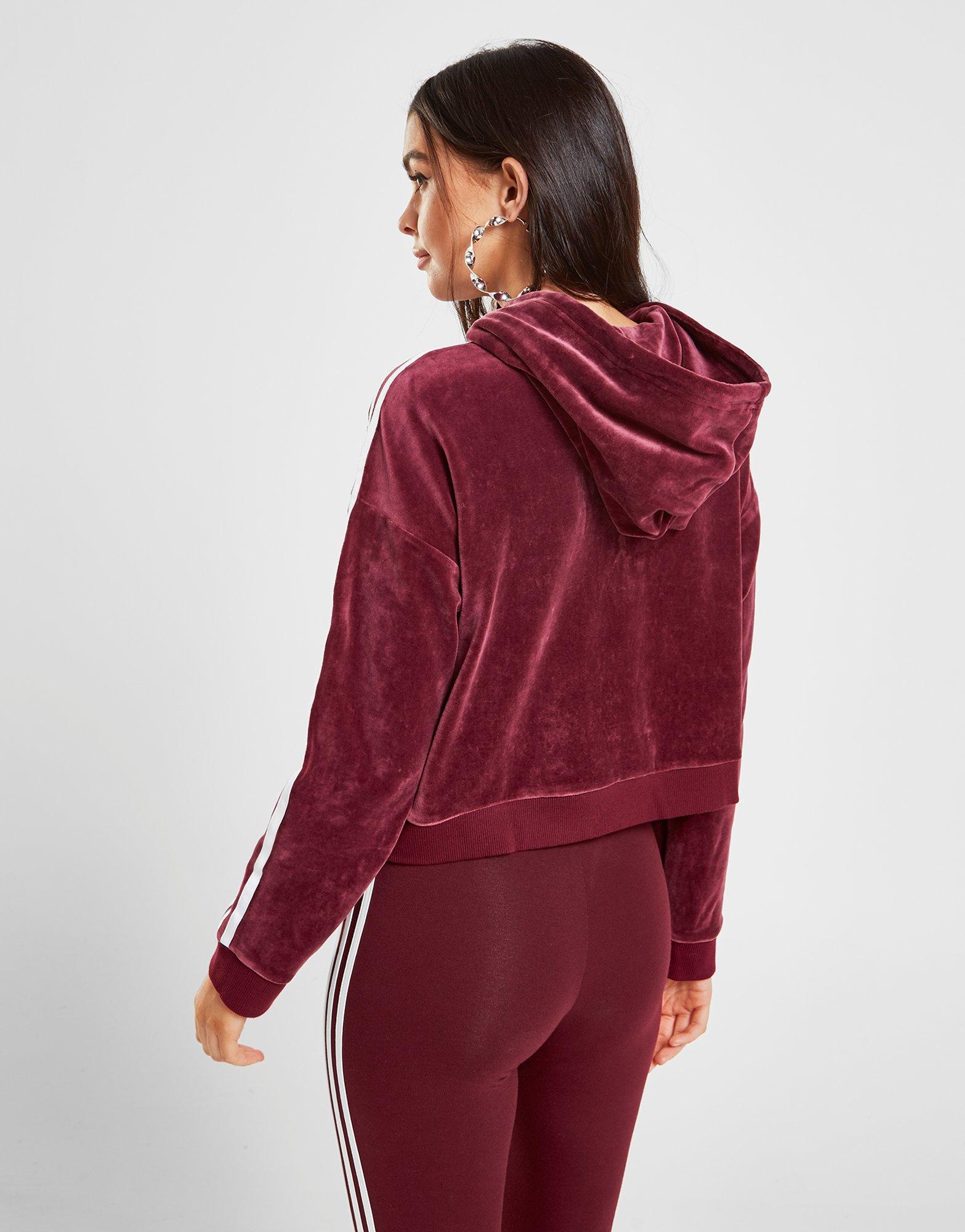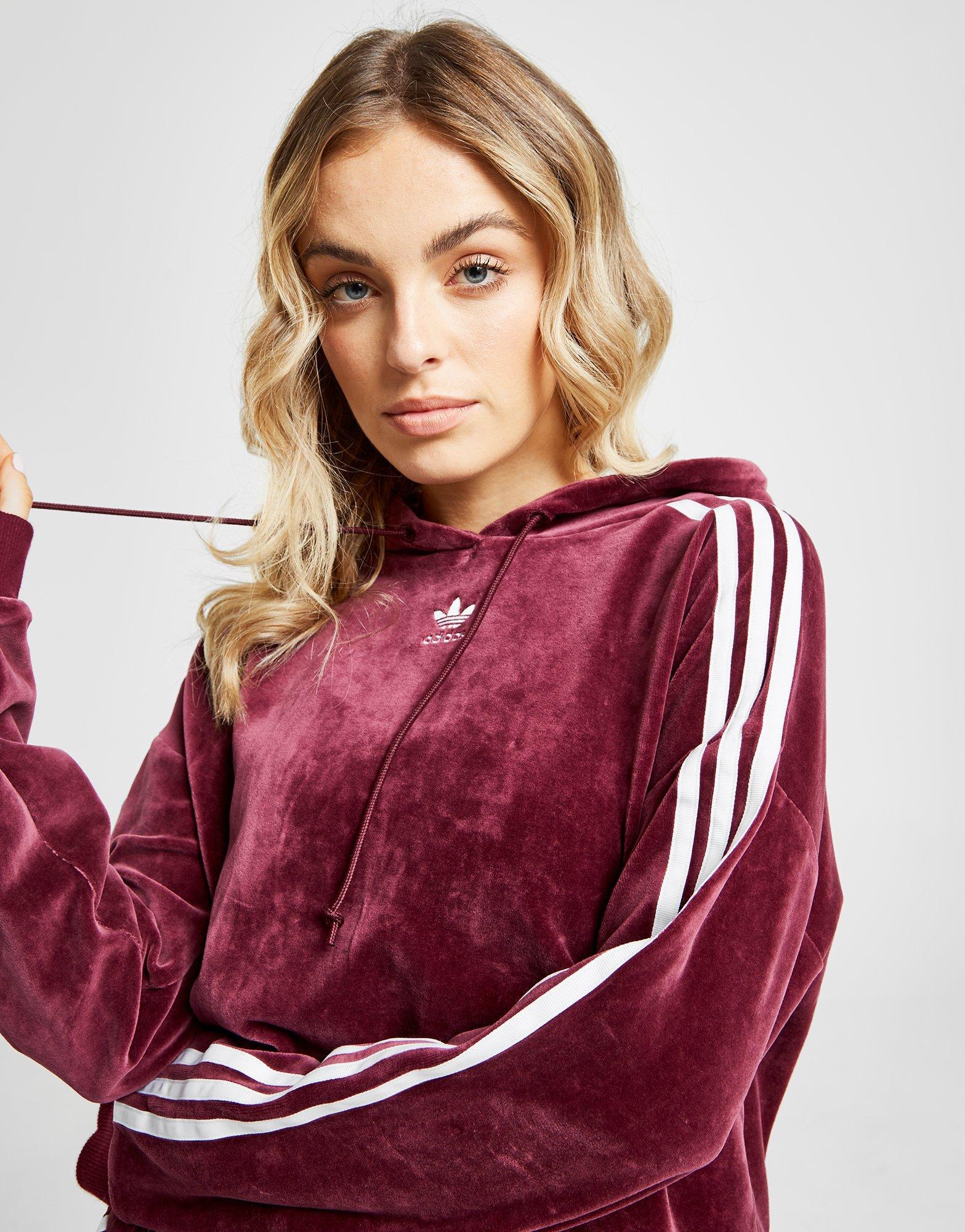 Go to JD SportsBring premium comf' to your off-duty days with this women's 3-Stripes Velvet Crop Overhead Hoodie from adidas Originals. In a bold maroon colourway, this hoodie is made from a poly-cotton blend with a soft velvet outer for luxury comfort when you're chillin' out. With comforting ribbed trims, the crop cut keeping you lookin' fresh whenever you step out. Finished with white 3-Stripes to the shoulders and the iconic Trefoil to the chest. Our model is 5'5" and wears a size small. Material: 70% Cotton/30% Polyester. Color: red