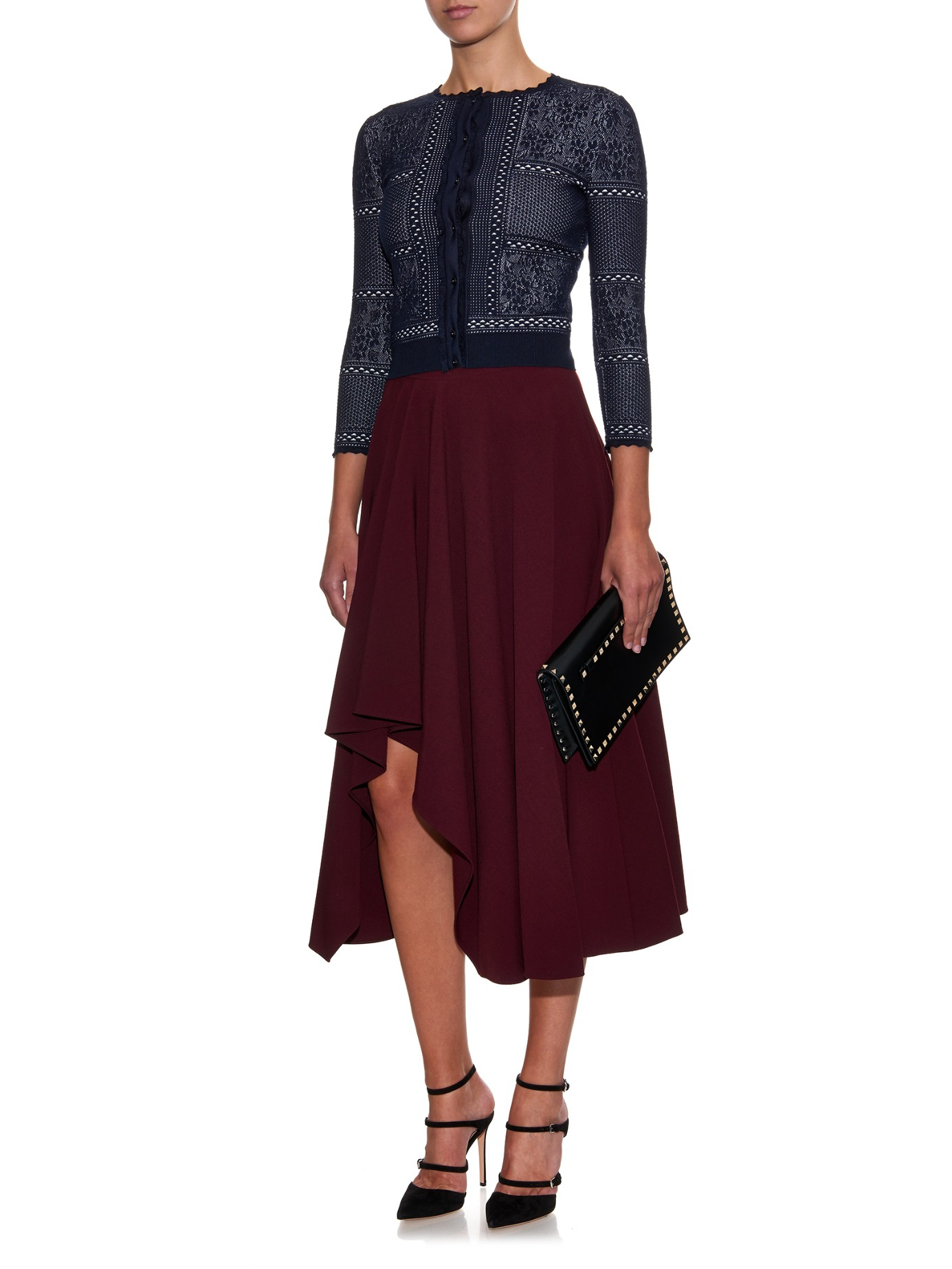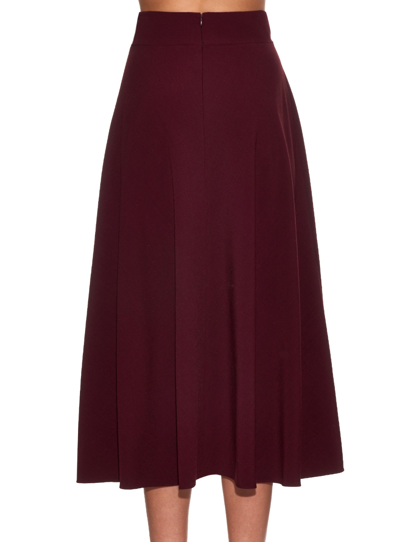 Go to MATCHESFASHIONAlexander McQueen's burgundy midi skirt is crafted from crepe that's just heavy enough to drape beautifully around the body. It's designed to sit high on the waist, and rises subtly at one side to reveal a flash of leg. Wear it with a cropped cardigan and strappy stilettos for an elegant evening look. Burgundy, heavy-weight crepe. High waisted, midi-length fluted hemline. Side hemline rise. Centre-back concealed zip-fastening. 57% rayon, 39% wool, 4% elastane. Details: 75% acetate, 25% silk. Dry clean. Country of origin: Italy. Fits true to size. Fitted at the waist, loose-fitting skirt. Color: purple
