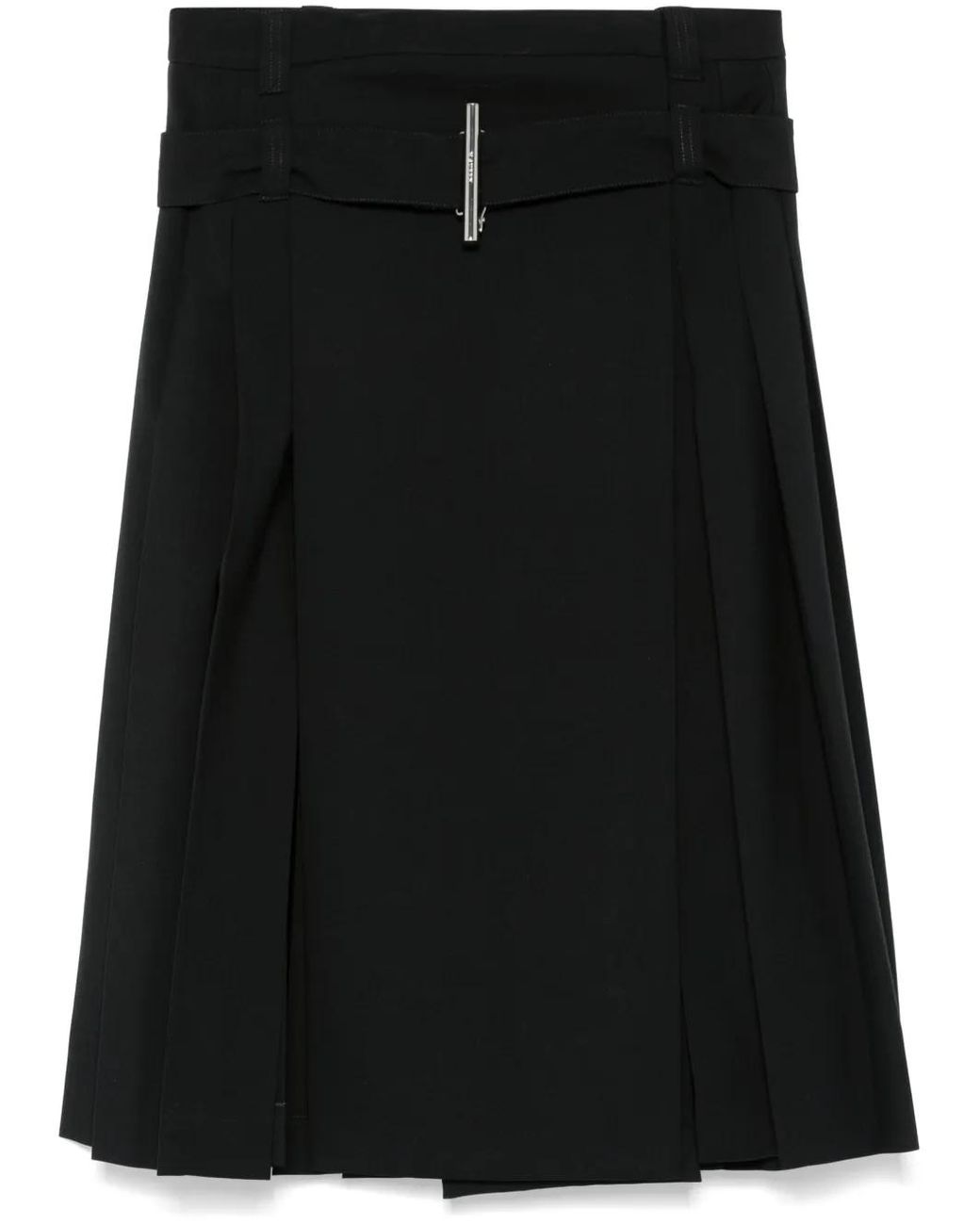 Black wool gabardine weave wrap design pleated skirt concealed front button and hook fastening mid-rise belt loops belted waist front slits partial lining straight hem mid-length Size: 42. Gender: Female. Material:Cotton/Wool. Color: black