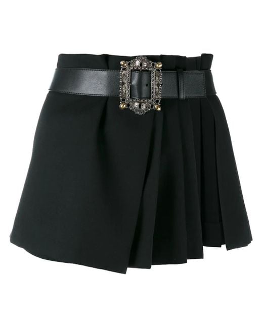 Black wool pleated wrap mini skirt from Alexander McQueen featuring a concealed button fastening and a calf leather waist belt. Size: 38. Gender: Female. Material:Wool/Cupro/Calf Leather. Color: black