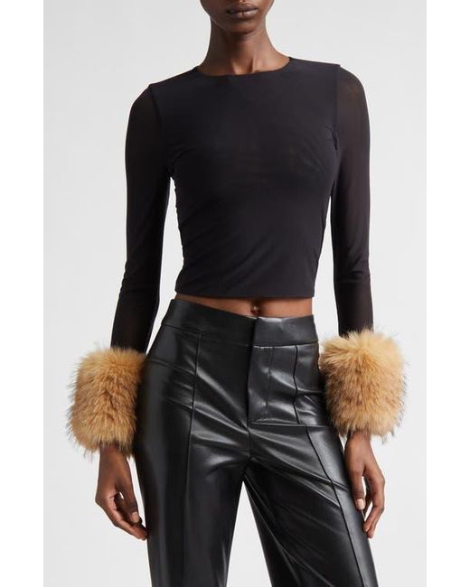Women's Black Delaina Faux Fur Cuff Mesh Crop Top