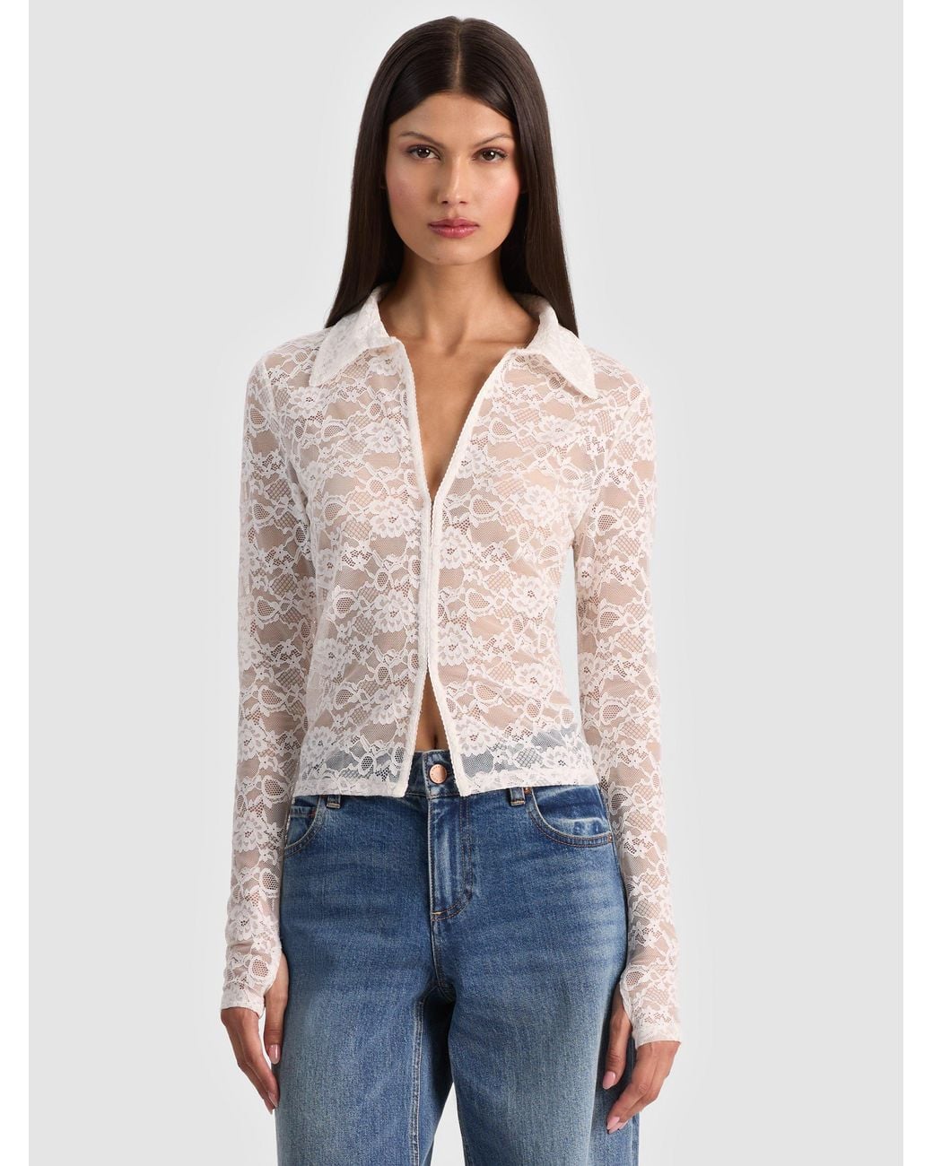 Feminine, modern, and perfect for layering - meet Kara. This sheer lace blouse is designed with hook-front closures and long sleeves featuring thumbhole sleeves for a modern edge. The fitted silhouette makes it ideal for layering, while the lace keeps it feeling romantic. It's delicate yet directional, striking the perfect balance. Wear it under a blazer or layered over a tonal bralette. Color: blue