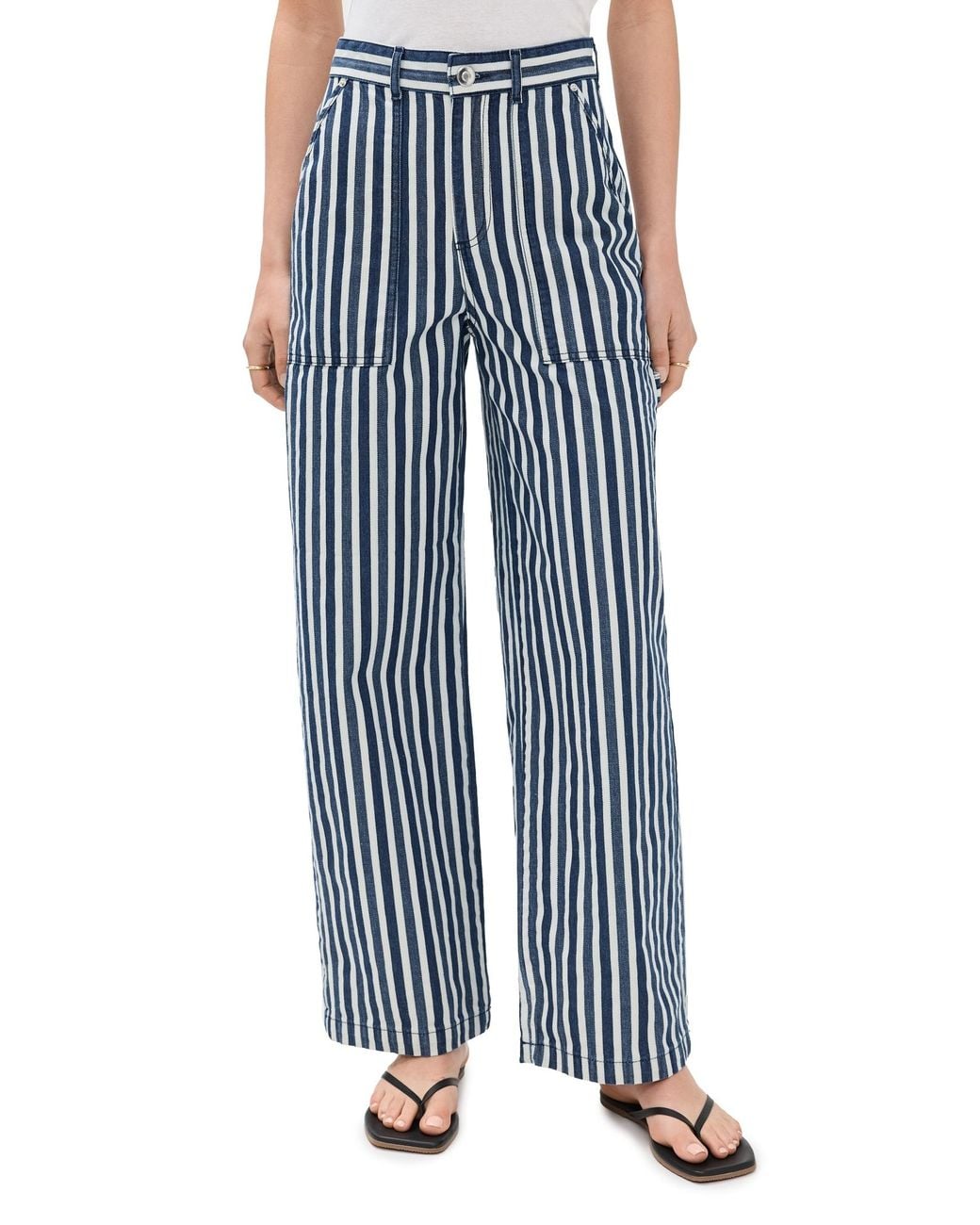 Fabric: Mid-weight, non-stretch denim. Stripe print. Leather logo patch at back. Button closure and zip fly. Slant hip pockets and patch back pockets. Shell: 100% cotton. Wash cold. Imported, Turkey. Measurements: Measurements from size 25 Rise: 11.5in / 29cm Inseam: 30.75in / 78cm Leg opening: 20.5in / 52cm Color: blue