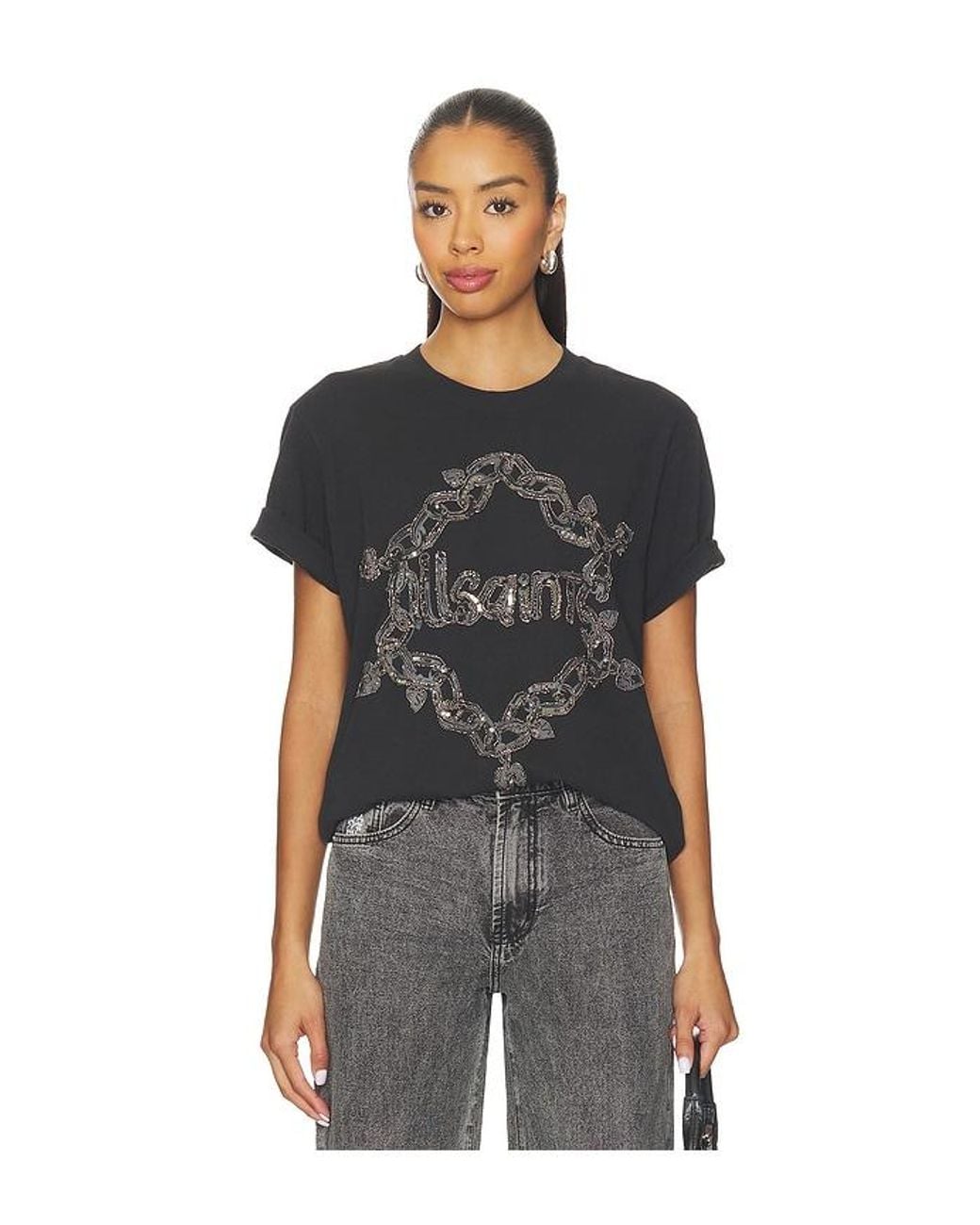 ALLSAINTS Drip Tee in Black. - size S (also in XS) ALLSAINTS Drip Tee in Black. - size S (also in XS) Self: 100% organic cotton Rib: 97% organic cotton 3% elastane. Made in India. Mild machine wash.. Beaded design at front. ALLR-WS247. W061JD. Founded in East London in 1994, AllSaints breaks through the noise to offer something different. Cult leather jackets and signature biker boots - it's what they do. Prints you weren't expecting, and accessories you'll keep coming back for. It's about innovation, about turning your back on the trends and making your own rules, a uniform without uniformity. AllSaints is an attitude, wear it your way. Color: black