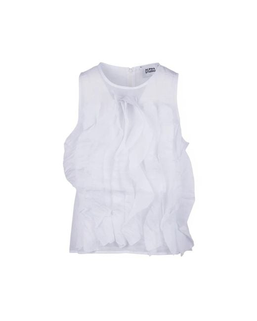 Alpha Studio Canotta con ruches is a sleeveless top that pairs decorative front ruching with a smooth, semi-sheer back for a refined, contemporary look. Key attributes: White | Bianco | Cotton | Back zipper closure | Round neckline | Sleeveless | Decorative front ruches | Smooth semi-sheer back | Dimensions & fit: Regular fit | Model wears size 40 and is 175 cm tall | Composition & care: 68% cotton, 32% polyamide | Follow manufacturer's care instructions. Color: white