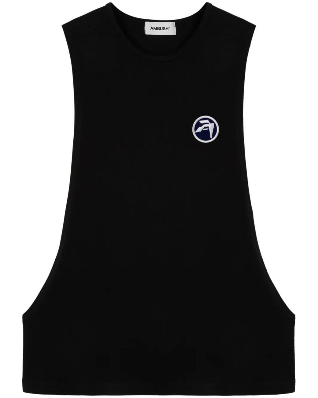 Black cotton round neck sleeveless drop armholes logo patch at chest straight hem Size: XS. Gender: Male. Material:Cotton. Color: black