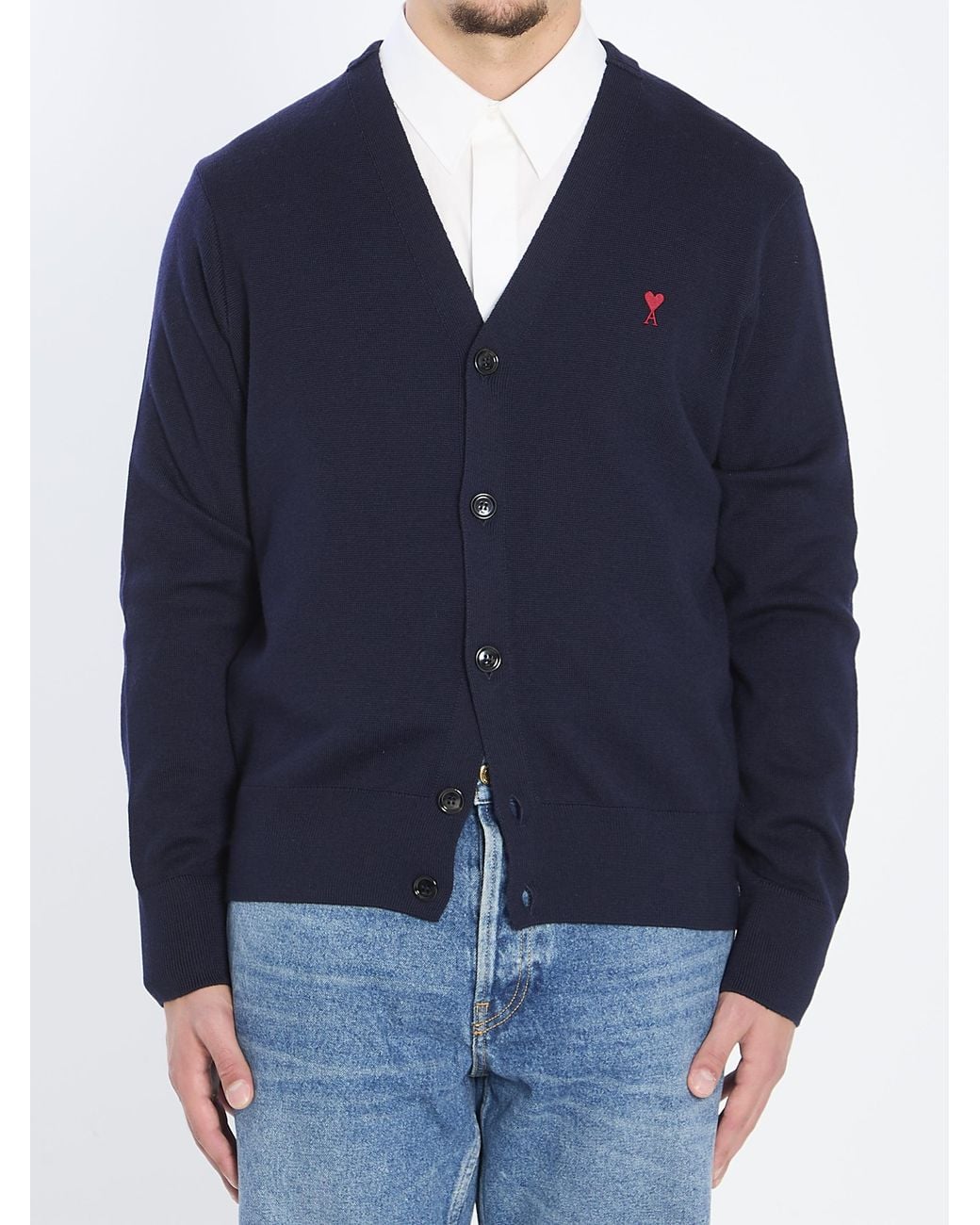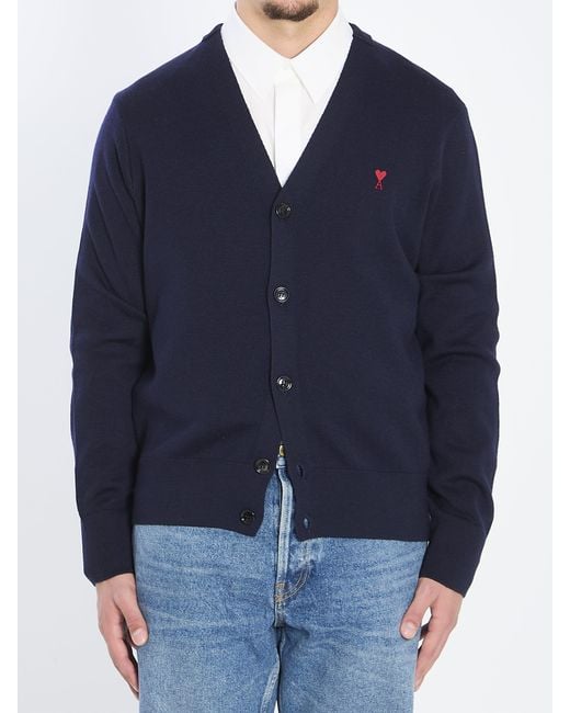 Navy blue extra-fine merino wool cardigan. Featuring a front button closure, small red Ami de Coeur logo appliqué on the chest, V-neckline, and ribbed hem and cuffs. Regular fit.Size nationality: INTSpecificationValueBrandAMI PARISComposition100% merino wool Made InPortugalColorBLUEGenderMenSeasonSS26 Color: blue