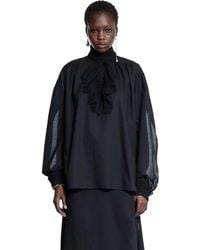 Go to SSENSESheer silk crepon blouse. · Round neck · Button closure · Lace trim at handkerchief hem and flared cuffs Supplier color: Black