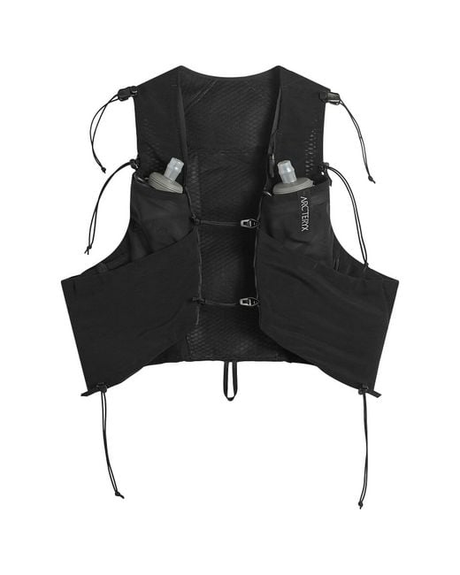 The Norvan 7 trail vest from Arc'teryx takes its name from the brand’s trail‑running lineage — a blend of “North” and “Vancouver” that nods to the rugged, wet terrain it’s built for. With a 7‑litre capacity, it’s designed for longer runs where you need to carry water, layers and essentials without slowing down. The fit stays close and stable thanks to multiple adjustable straps that minimise bounce and keep the load secure on technical terrain. A lightweight, purpose‑built vest shaped for big mileage and fast movement. Suitable for Short & Long Distance Runs, 72% Nylon, 28% Elastane, Mesh Stash Pockets, Small Zip Pocket, 2x 500ml Bottles Included, Reflective Branding, Style Code: X000006747-002291, Shop All Men's Arc’teryx Backpacks, Shop All Men's Backpacks. Arc'teryx Men's Norvan 7 Trail Vest in Black, Size Large | END. Clothing Color: black