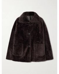 Go to LeamReversible coat in cream-colored and brown shearling on one side and soft cream-colored leather with shearling inserts on the other side. It features self-tie belt on waist and two side welt pockets. The