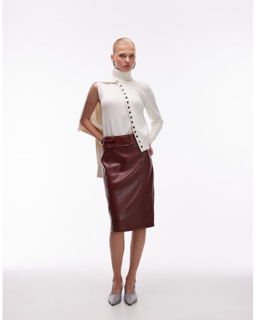 Women's Red Faux Leather Waistband Pocket Detail Midi Skirt