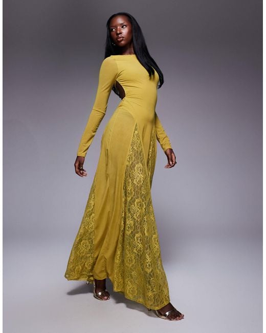 - Long Sleeve Sheer Maxi Dress With Lace Panel Godets And Bodysuit