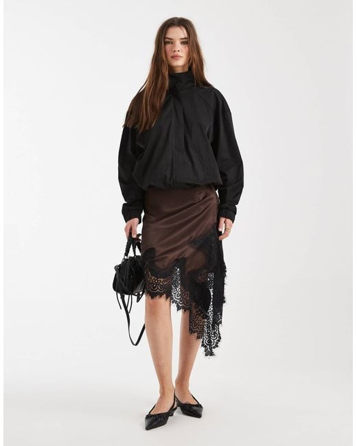 Satin Lace Trim Bias Midi Skirt - Brown