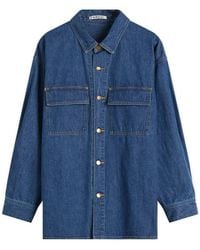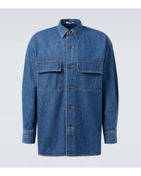 Go to BaltiniAuralee's blue cotton denim shirt, featuring long sleeves with buttoned cuffs, a classic collar, a front button placket, side slits, and two chest pockets with flaps.. Gender: Men. Material: 100% Cotton. Color: BLUE.