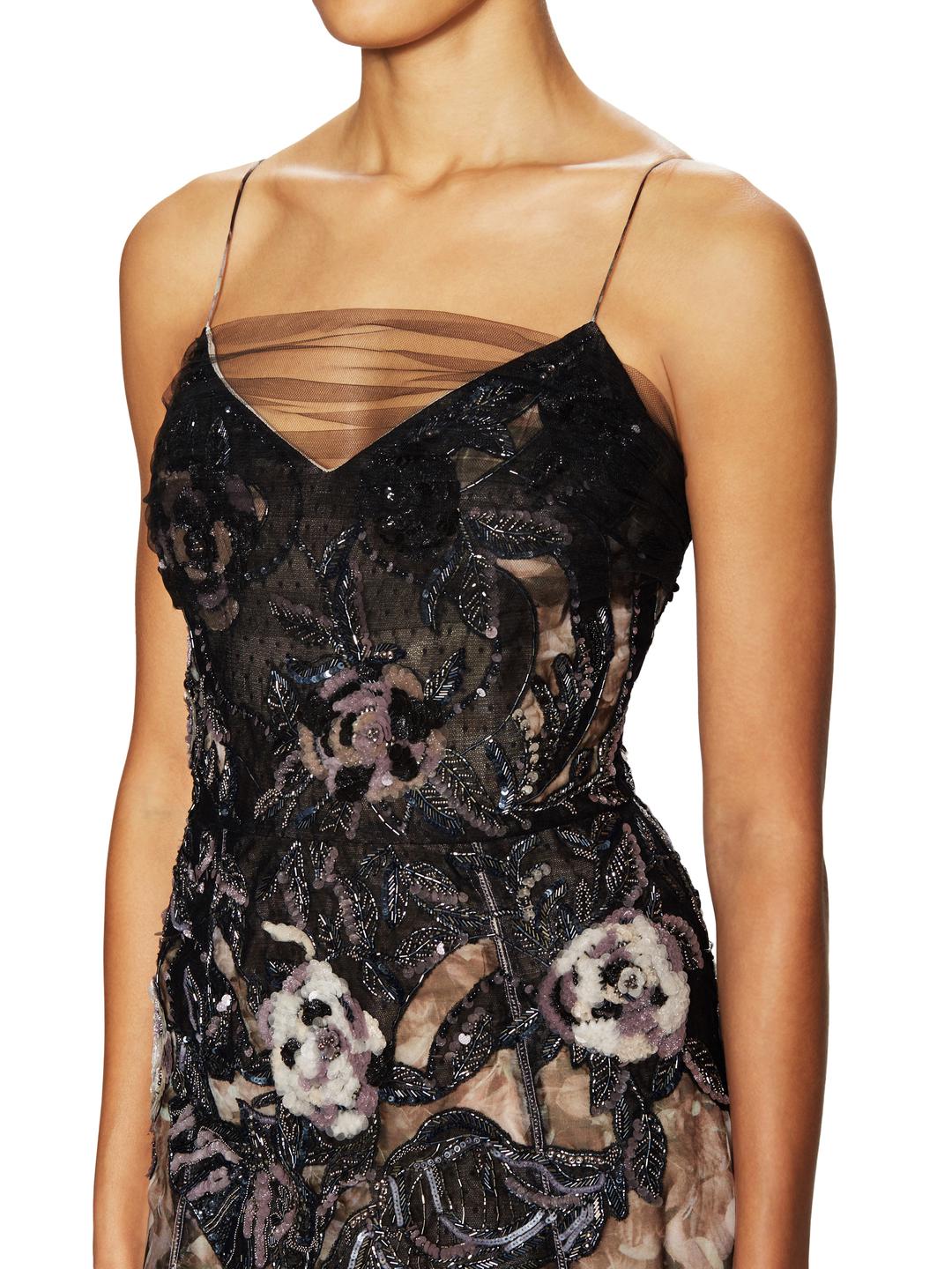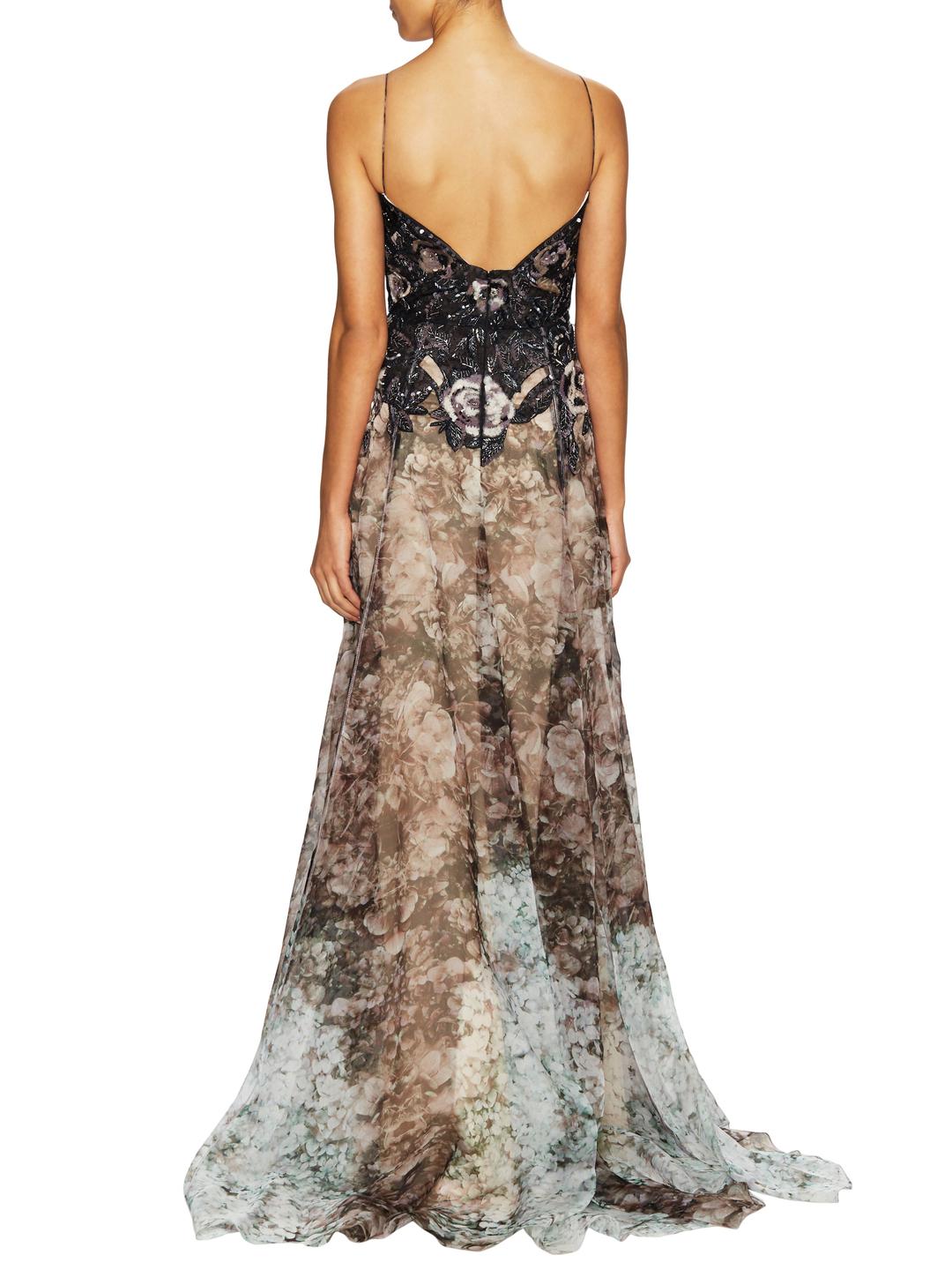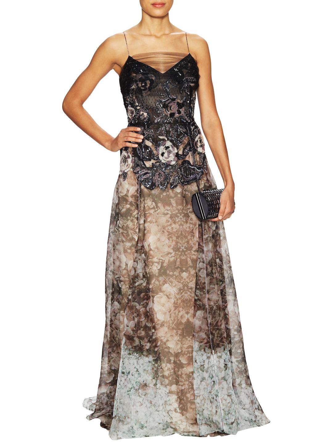 Go to GiltWoven silk gown. V-neck. Spaghetti shoulder straps. Embellished beading at bodice. Graphic print at skirt. Fitted bodice. A-line hem. Tonal top stitching and panel seaming. Hidden back zipper closure. Fully lined. 34" in circumference at bust; 62" from shoulder to hem; taken from a size 6. Model's height is 5 feet 9 inches. 100% silk shell; 92% silk and 8% spandex lining. Spot clean only. Badgley Mischka Couture. United States.