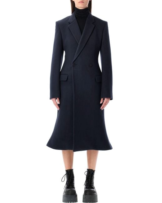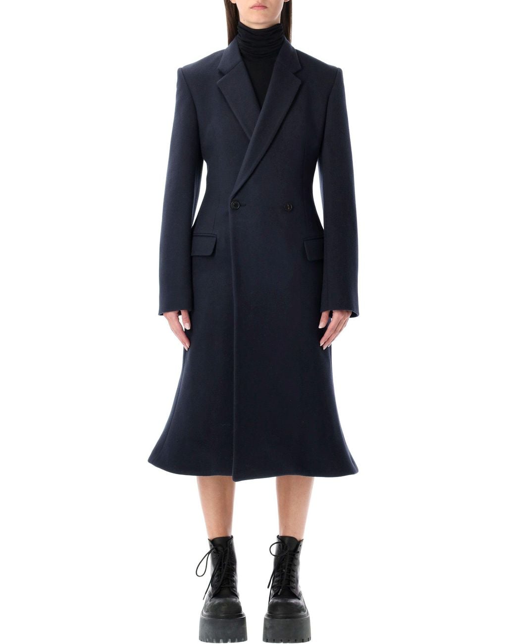 Navy blue brushed wool coat by , featuring padded shoulders, classic lapels, double-breasted front with two buttons, fitted waist, two front flap pockets, and flared godet hem.SpecificationValueSeasonFW25CompositionFABRIC I: 100% WOOL / LINING: 100% CUPRO / POCKET LINING: 100% COTTONColorBLUEColor Code8230Made InITALYISOITDepartmentWomenSectionCLOTHINGSubsectionOUTERWEARSize InformationCLOTHING FRSize CodeFR