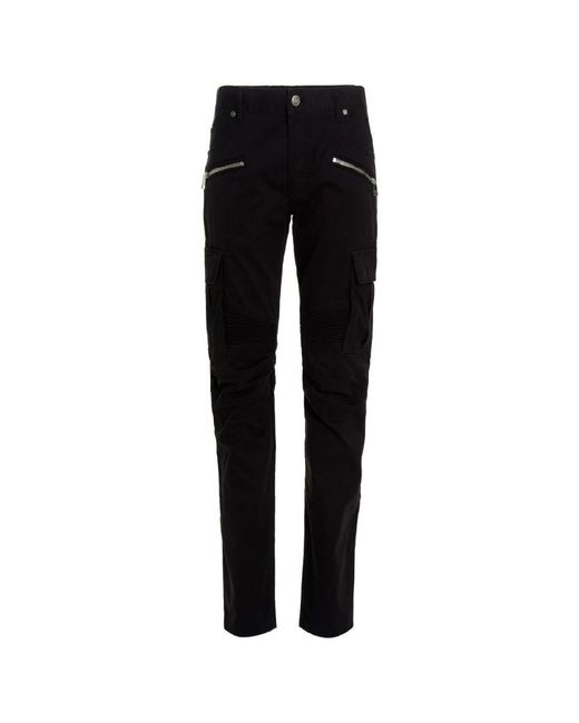Balmain Mens Bottoms. Fashion category: Jeans & Denim. SKU: WH1MH015146D-0PC. Color: Black Delave. Balmain B Embossed Cotton Cargo Jeans. These cargo jeans feature an embossed logo on the rear, belt loops, a button fly fastening, two side flap pockets, two side zip-fastening pockets, two rear patch pockets, and a tapered leg. 100% Cotton.