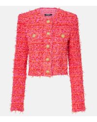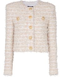 Go to BalmainSparkly textured tweed jacketRound necklineStructured shouldersLong sleeves2 fake pockets with decorative buttonsFront fastening with 5 press studs"Double Chain Lion" buttons in gold metalCropped fitModel measures 179cm and wears a size 36Main material: 100% polyamideMade in FranceItem: EF1SK248KB19 Color: white