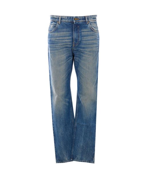 Balmain denim jeans, zip and button closure, embroidered detail on the backì, patch logo on the back, straight fitComposition: 100% Cotton, 65% Polyester, 35% Cotton