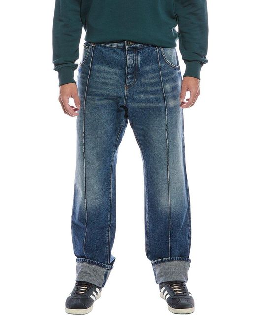 About the brand: Edgy, opulent style from an iconic fashion house. Straight Medium Wash Jean in blue with belt loops, silver-tone hardware, and classic five-pocket styling Inseam approximately 31in; 12in rise Model is 6'1 and is wearing a size 32. Measurements may vary slightly by size. Zip fly with button closure 65% polyester, 35% cotton Hand wash Made in Italy.