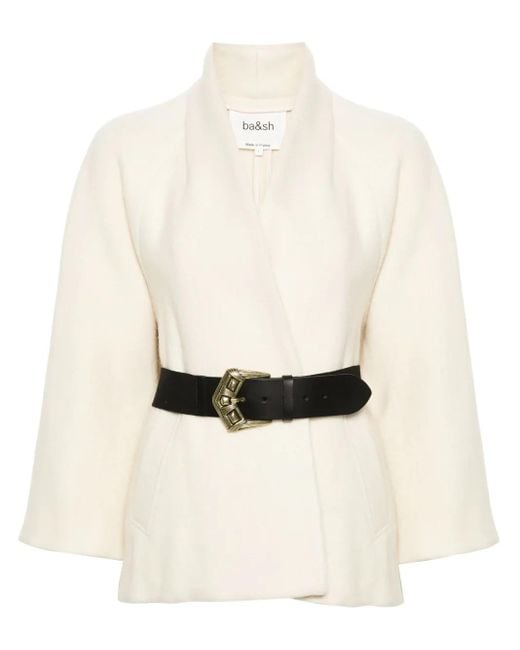Ivory white wool knitted construction brushed effect shawl collar long raglan sleeves two front welt pockets detachable and adjustable waist belt unlined straight hem buckle fastening Size: S. Gender: Female. Material:Cotton/Elastodiene/Cotton/Acrylic/Calf Leather/Wool. Color: white