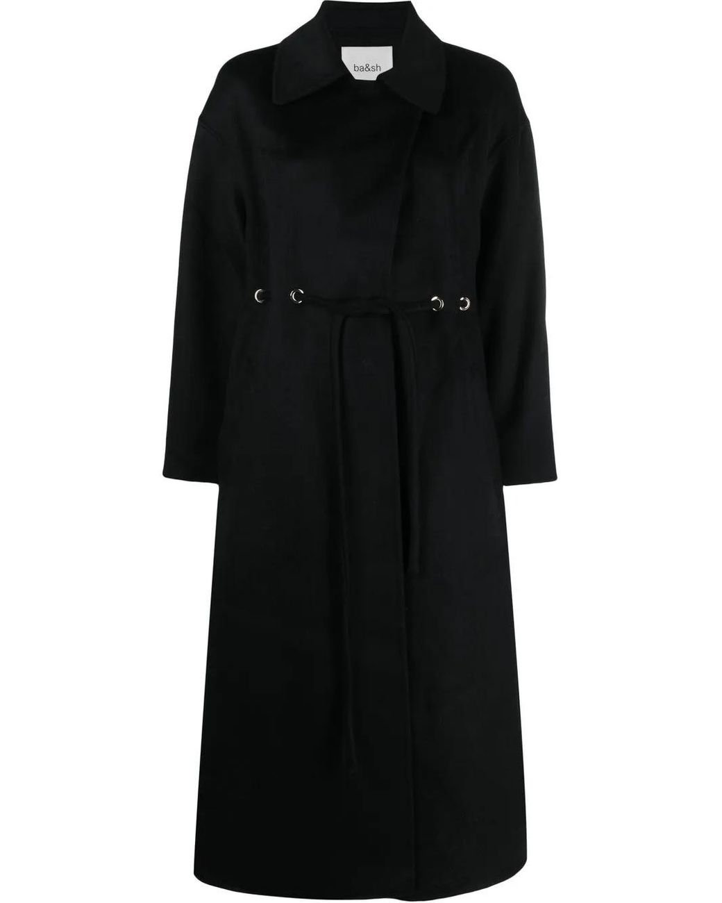 Black wool blend wrap design drawstring waist classic collar long sleeves straight hem mid-calf length Size: S. Gender: Female. Material:Polyamide/Wool/Polyester. Color: black