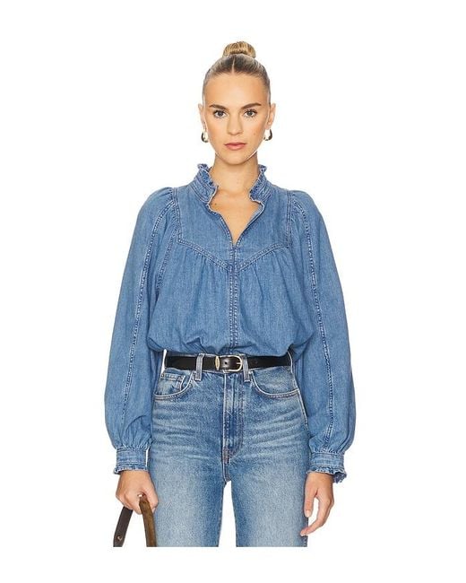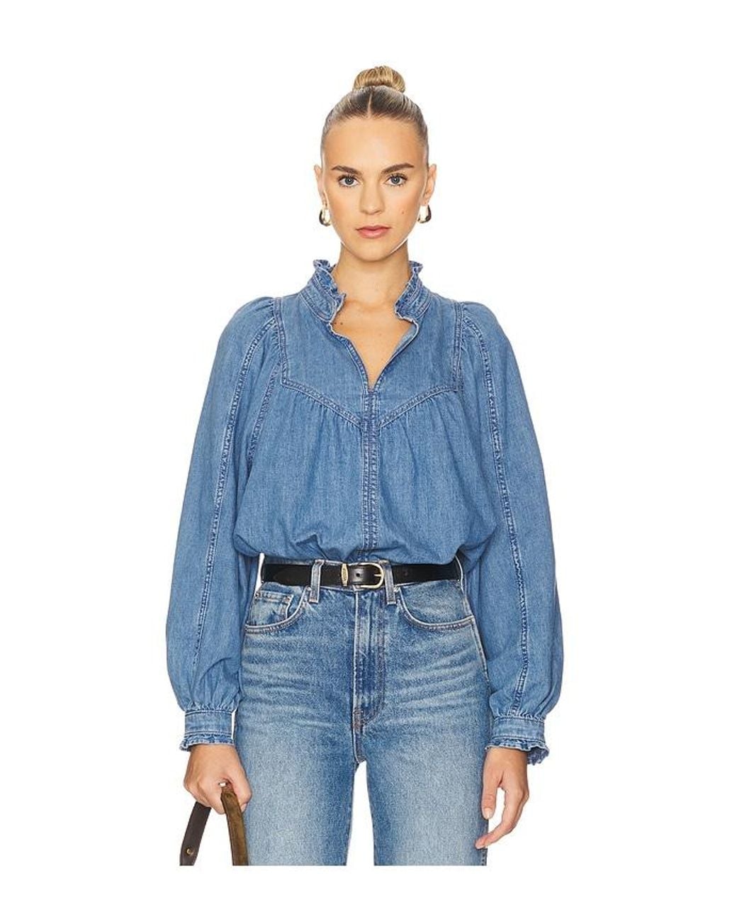 Ba&sh Lay Top in Blue. - size 0 / XS (also in 1 / S) ba&sh Lay Top in Blue. - size 0 / XS (also in 1 / S) 100% cotton. Dry clean. Long puff sleeves. V-neckline. Frilly details. Denim fabric. BAAN-WS54. 1H25LAY. Ultra-cool Parisian label Ba&sh was launched in 2003 by childhood friends Barbara Boccara and Sharon Krief, who wanted to produce an ideal closet of laidback luxe. Look to Ba&sh for a delicate mix of simple, chic designs that are modern and feminine. Color: blue