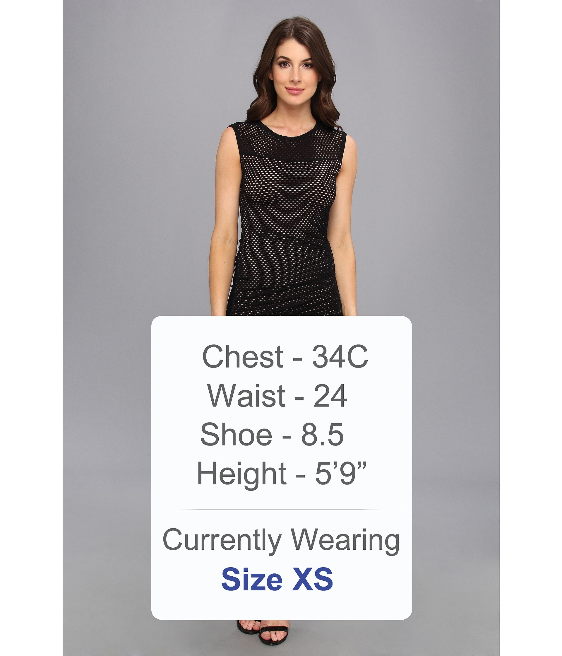 Body-conscious sleeveless dress flaunts a fierce mesh overlay throughout. Rounded neckline. Unlined straight yoke. Side zip placket complements the asymmetrical shirring throughout. 95% rayon, 5% spandex; lining: 92% polyester, 8% spandex. Hand wash cold, dry flat. Measurements: length: 41 in length: 41 in product measurements were taken using size xs (us 2). Color: black