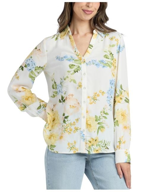 Don a polished look in this printed button-up top from Bcx, designed with a classic collar and long sleeves for a professional look. This versatile shirt offers a sleek silhouette without pockets for a clean, streamlined appearance. Polyester. Color: multicolor