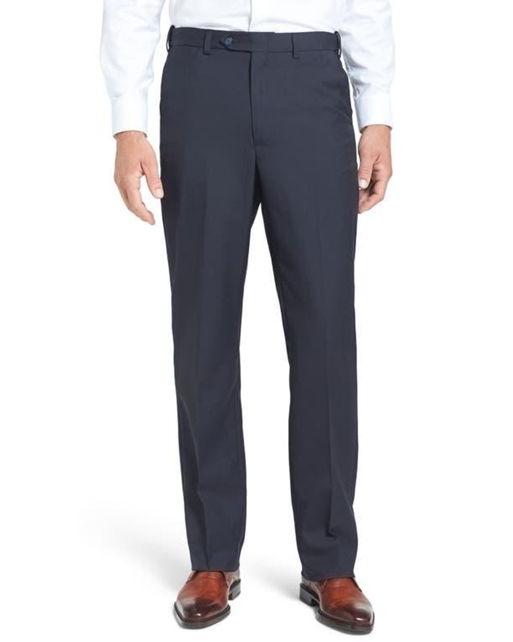 Men's Blue Self Sizer Waist Plain Weave Flat Front Washable Pants