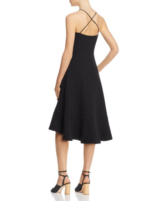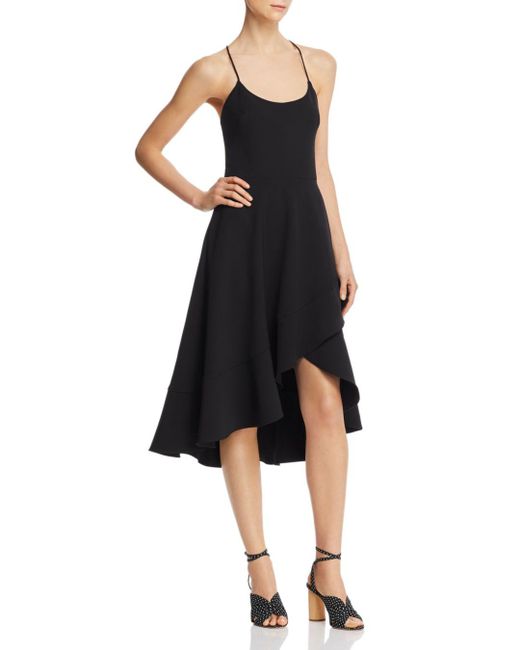 SIZE & FIT. • Fits slightly small; if between sizes, order one size up. Body-skimming fit through bust and waist; relaxed fit through hips. Non-stretch fabric. Designed to hit at the knees. Approx. 46" from high point shoulder to hem, based on a size 2. • Model measurements: 5'10" height, 33.5" bust, 23.5" waist, 34.5" hips, wearing a size 2. FEATURES. Scoop neck. Fixed straps with criss-cross back. Darted bust. Strapless-bra-friendly. Seamed waist. Asymmetric tiered flounce skirt with high/low hem. Concealed back zip with hook-and-eye closure, lined. Please note that this dress will be delivered with a black b-tag attached, with instructions for removal included. If the b-tag is removed, the dress cannot be returned. This item is part of our 100% bloomingdale's collection, featuring exclusive pieces you won't find anywhere else. 88% polyamide/12% elastane; lining: 96% polyamide/4% elastane. Dry clean. Made in usa. Color: black