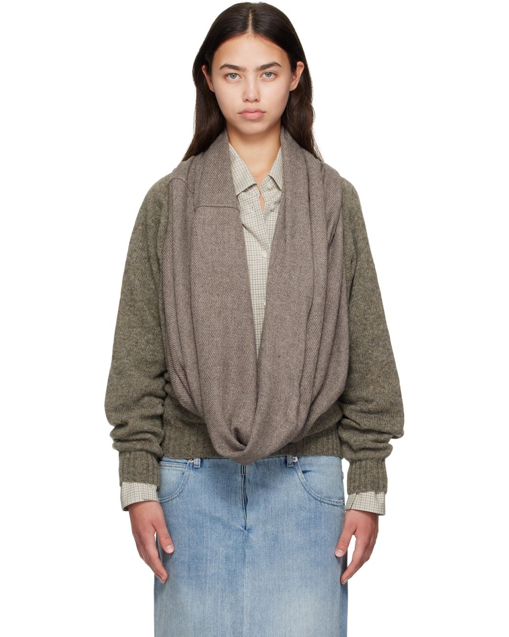 Knit Shetland wool sweater. · Modified plunging cowl neck · Logo stud at front · Rib knit hem and cuffs Supplier color: Brown/Brown